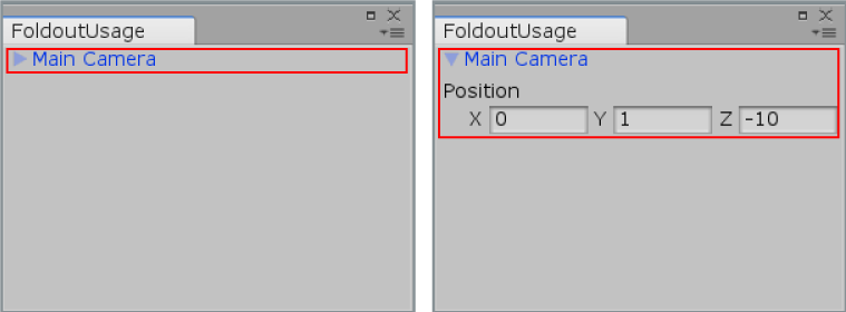 // Create a foldable menu that hides/shows the selected transform position. // if no Transform is selected, the Foldout item will be folded until a transform is selected. public class EditorGUIFoldout : EditorWindow { public bool showPosition = true; public string status = "Select a GameObject"; [MenuItem("Examples/Foldout Usage")] static void Init() { UnityEditor.EditorWindow window = GetWindow(typeof(EditorGUIFoldout)); window.position = new Rect(0, 0, 150, 60); window.Show(); }