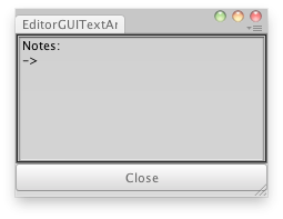 void OnGUI() { note = EditorGUI.TextArea(new Rect(3, 3, position.width - 6, position.height - 35), note); if (GUI.Button(new Rect(0, position.height - 30, position.width, 25), "Close")) { this.Close(); } } }