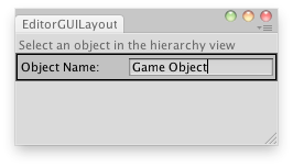 void OnGUI() { GUILayout.Label("Select an object in the hierarchy view"); if (Selection.activeGameObject) Selection.activeGameObject.name = EditorGUILayout.TextField("Object Name: ", Selection.activeGameObject.name); this.Repaint(); } }