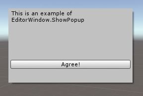 void OnGUI() { EditorGUILayout.LabelField("This is an example of EditorWindow.ShowPopup", EditorStyles.wordWrappedLabel); GUILayout.Space(70); if (GUILayout.Button("Agree!")) this.Close(); } }