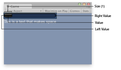 void OnGUI() { hSbarValue = GUILayout.HorizontalScrollbar(hSbarValue, 1.0f, 0.0f, 10.0f); GUILayout.Label("This is a text that makes space"); } }