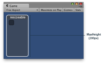 void OnGUI() { windowRect = GUILayout.Window(0, windowRect, ScalingWindow, "resizeable", GUILayout.MinHeight(80), GUILayout.MaxHeight(200)); }