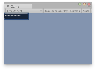 void OnGUI() { // Make a password field that modifies passwordToEdit. passwordToEdit = GUILayout.PasswordField(passwordToEdit, "*"[0], 25); } }
