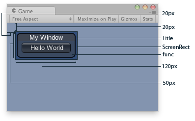 // Make the contents of the window void DoMyWindow(int windowID) { // This button will size to fit the window if (GUILayout.Button("Hello World")) { print("Got a click"); } } }